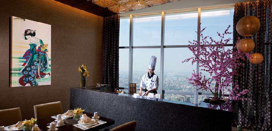 简约雅致装潢,无敌城市景观,置身云端品鉴冰醇清酒,演绎日本料理极致。餐厅设有10间可容纳6-30人的贵宾厅及铁板烧贵宾房。