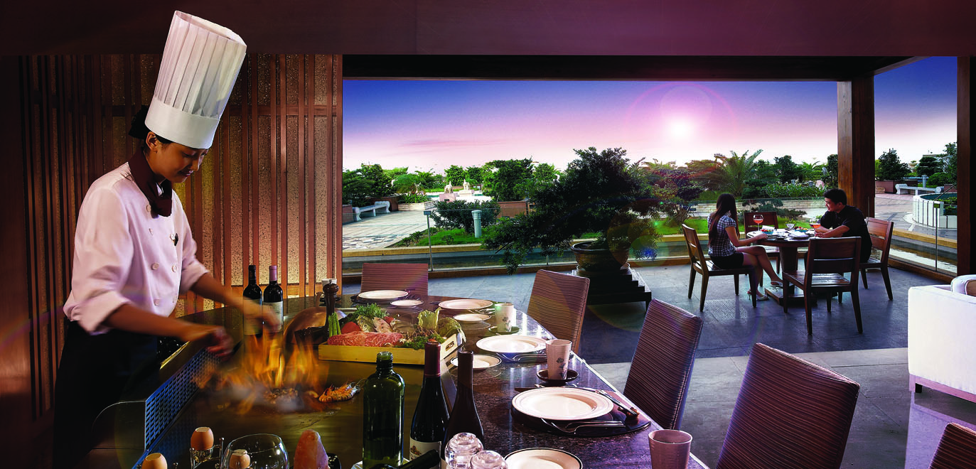 位于主楼9层,拥有190个座位及铁板烧包房的天台花园式日本料理,特聘米其林三星日式料理大师指导,荟萃地道东瀛和食及法式铁板烧。